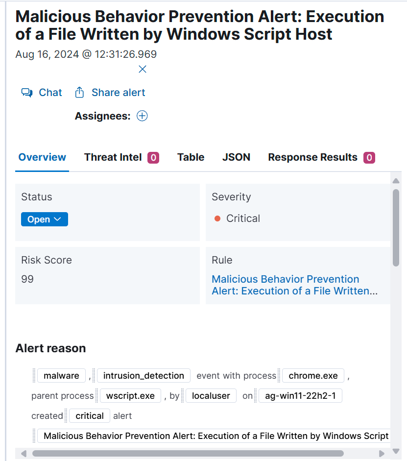 This above picutre tells us that a process with the name "chrome", with parent process wscript.exe, was executed by localuser on the machine and its categorized as critical.