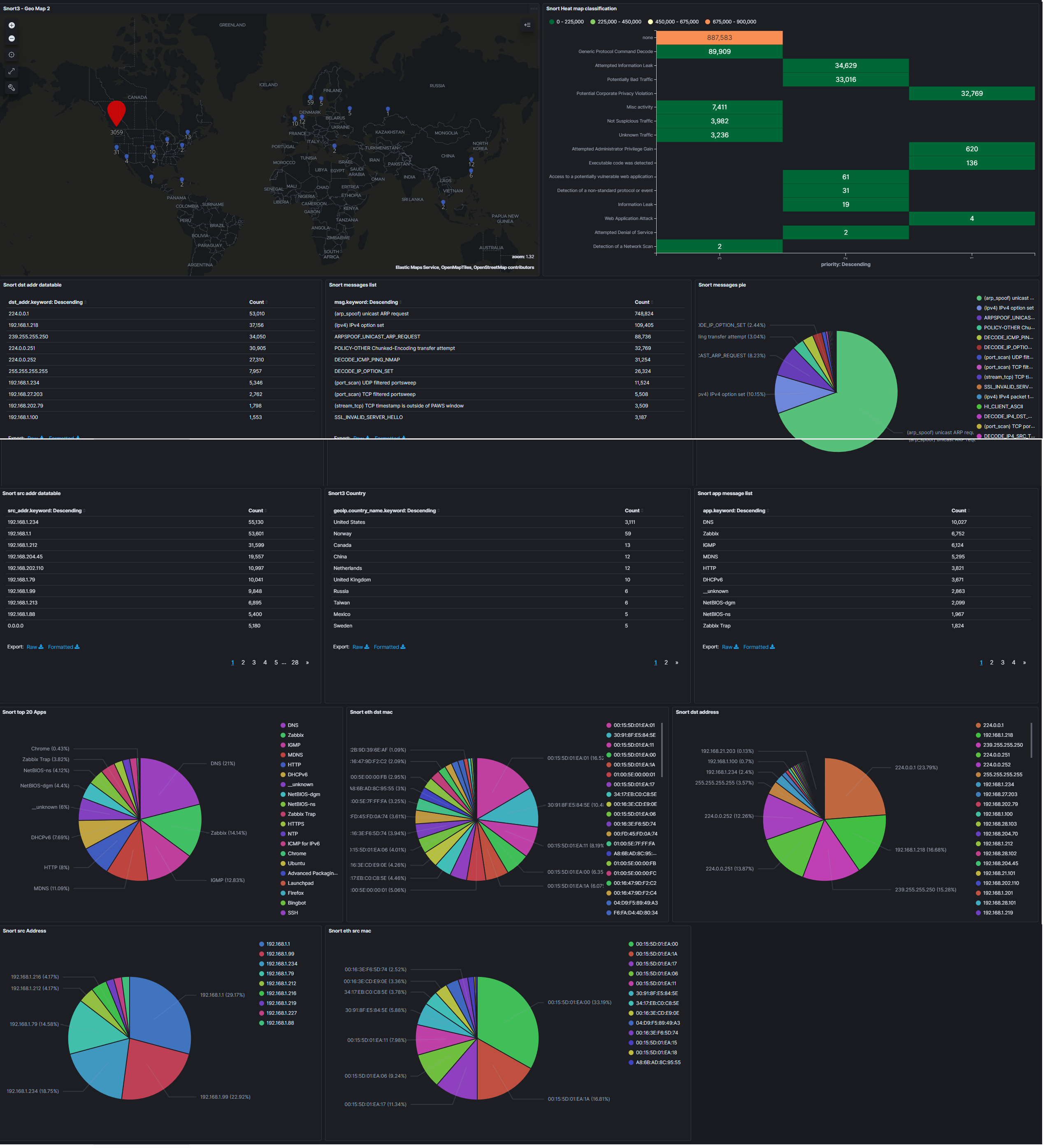 • Click on the Stach Management> Index Patterns > Create index pattern, set the name to logstash-snort3j, and click Create.* Click on the created index pattern and edit the b64_data. You can find it in "Fields". Set Format = String and Transfor = Base64 Decode and then click update field.* Click on stach Management > Index Patterns > Create Index, set the name to logstash-snort3a, and then click create. * Click the scripted fileds tab, + Add Scripted Field, set Name = app_total_bytes and Script = doc['bytes_to_client'].value+doc['bytes_to_server']. value and then click Create field.