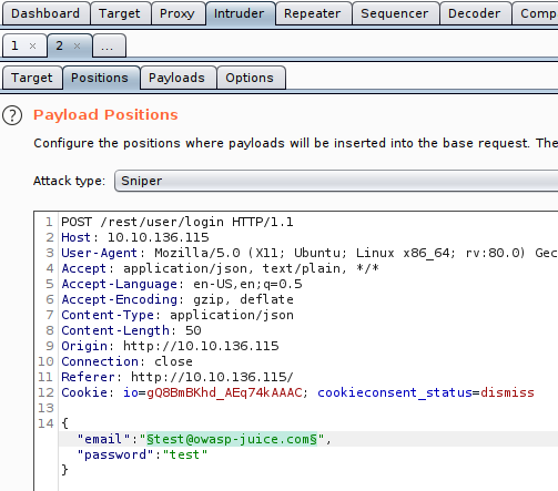 Return to the Intruder in Burp. In our previous task, we passed our failed login attempt to both Repeater and Intruder for further examination. Open up the Positions sub-tab in the Intruder tab with this request now and verify that 'Sniper' is selected as our attack type.