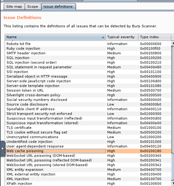 The issue definitions found here are how Burp Suite defines issues within reporting. While getting started, these issue definitions can be particularly helpful for understanding and categorizing various findings we might have. Which poisoning issue arises when an application behind a cache process input that is not included in the cache key?