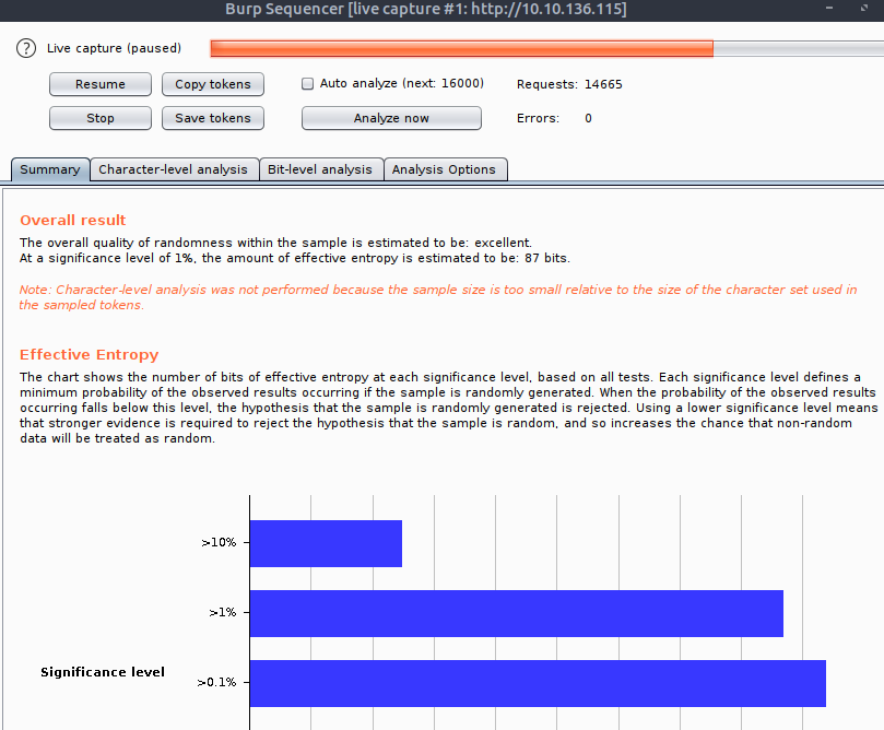 Let Sequencer run and collect ~10,000 requests. Once it hits roughly that amount hit 'Pause' and then 'Analyze now'