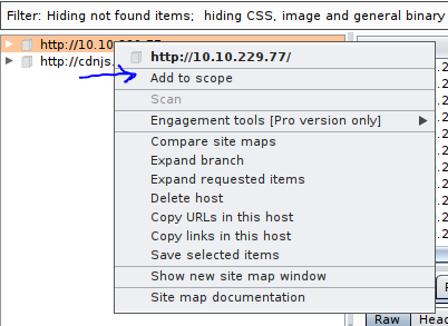 Navigate to the Target tab in Burp. In our last task, Proxy, we browsed to the website on our target machine (in this case OWASP Juice Shop). Find our target site in this list and right-click on it. Select 'Add to scope'.