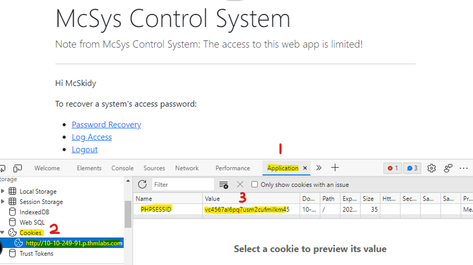 To find the session ID in the browser, you can open the developer tools (SHIFT+CTRL+I), then the Application tab. From the left menu, select Cookies and select the target website. There is a PHPSESSID  and the value. In my case, the value is vc4567al6pq7usm2cufmilkm45. Therefore, the file will be as sess_vc4567al6pq7usm2cufmilkm45. Finally, we know it is stored in /tmp. Now we can use the LFI to call the session file.