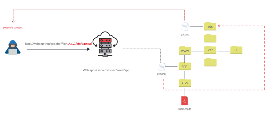 We can test out the URL parameter by adding payloads to see how the web application behaves. Path traversal attacks, also known as the dot-dot-slash attack, take advantage of moving the directory one step up using the double dots ../. If the attacker finds the entry point, which in this case get.php?file=, then the attacker may send something as follows, http://webapp.thm/get.php?file=../../../../etc/passwd