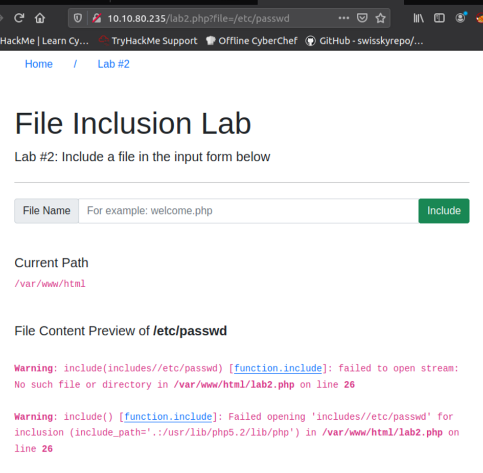 Warning: include(languages/etc/passwd): failed to open stream: No such file or directory in /var/www/html/THM-5/index.php on line 15