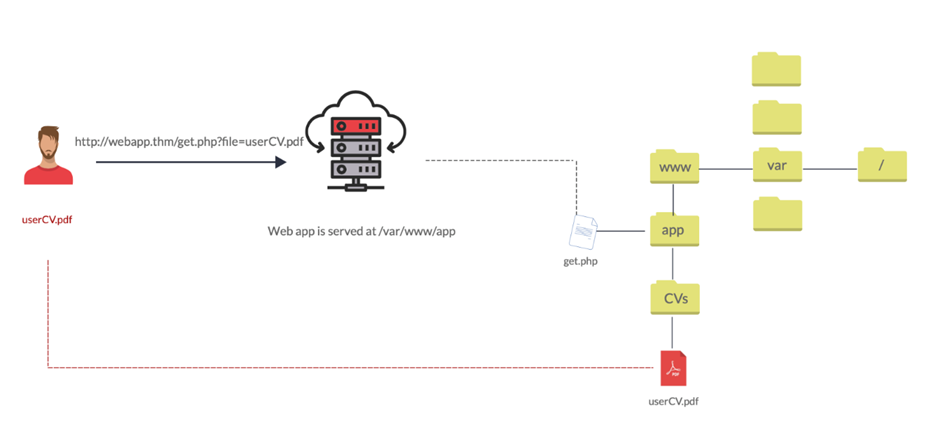 Let's discuss a scenario where a user requests to access files from a webserver. First, the user sends an HTTP request to the webserver that includes a file to display. For example, if a user wants to access and display their CV within the web application, the request may look as follows, http://webapp.thm/get.php?file=userCV.pdf, where the file is the parameter and the userCV.pdf, is the required file to access.