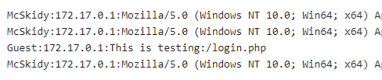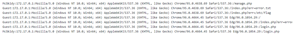 We can see that the log page stores four different headers, including username, IP address, User-Agent, and the visited page.  The User-Agent is an HTTP header that includes the user's browser information to let servers identify the type of operating system, vendor, and version. The User-Agent is one of the HTTP headers that the user can control. Therefore, in order to get the RCE, you need to include PHP code into User-Agent and send a request to the log file using the LFI to execute in the browser.  Now, let's test if we can include User-Agent value into the web application log file, and see if our record is recorded!