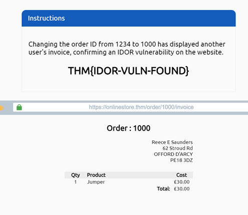 Curiosity gets the better of you, and you try changing the user_id value to 1000 instead (http://online-service.thm/profile?user_id=1000), and to your surprise, you can now see another user's information. You've now discovered an IDOR vulnerability! Ideally, there should be a check on the website to confirm that the user information belongs to the user logged requesting it.