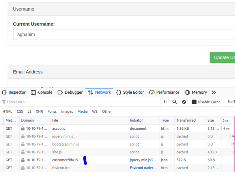 We'll start by investigating how this information gets pre-filled. If you open your browser developer tools, select the network tab and then refresh the page, you'll see a call to an endpoint with the path /api/v1/customer?id={user_id}.