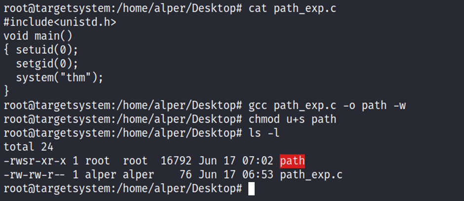 If any writable folder is listed under PATH we could create a binary named thm under that directory and have our “path” script run it. As the SUID bit is set, this binary will run with root privilege