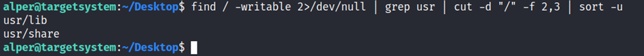 find / -writable 2>/dev/null | cut -d "/" -f 2,3 | grep -v proc | sort -u
