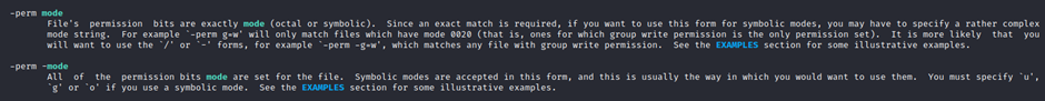 The reason we see three different find commands that could potentially lead to the same result can be seen in the manual document. As you can see below, the perm parameter affects the way “find” works.