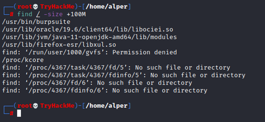 The example above returns files that are larger than 100 MB. It is important to note that the find command tends to generate errors which sometimes makes the output hard to read. This is why it would be wise to use the “find” command with -type f 2>/dev/null to redirect errors to “/dev/null” and have a cleaner output (below).