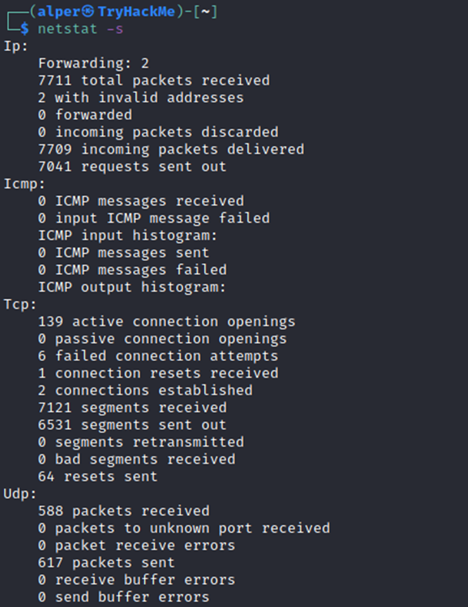 • netstat -s: list network usage statistics by protocol (below) This can also be used with the -t or -u options to limit the output to a specific protocol.
