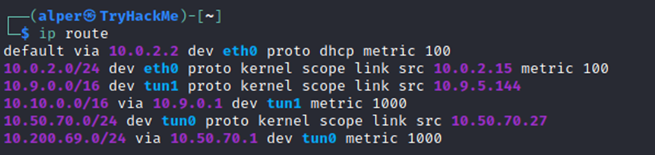 The target system may be a pivoting point to another network. The ifconfig command will give us information about the network interfaces of the system. The example below shows the target system has three interfaces (eth0, tun0, and tun1). Our attacking machine can reach the eth0 interface but can not directly access the two other networks.