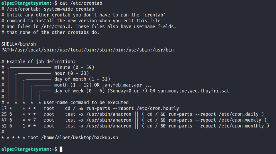If there is a scheduled task that runs with root privileges and we can change the script that will be run, then our script will run with root privileges. Any user can read the file keeping system-wide cron jobs under /etc/crontab