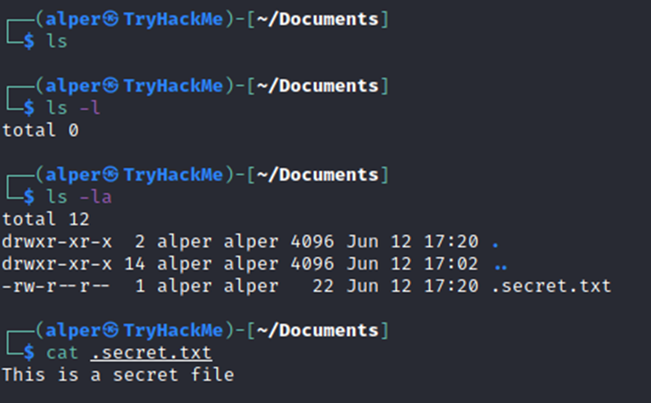 While looking for potential privilege escalation vectors, please remember to always use the ls command with the -la parameter. The example below shows how the “secret.txt” file can easily be missed using the ls or ls -l commands.