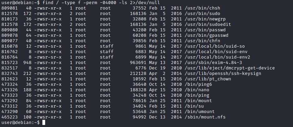 • find / -perm -u=s -type f 2>/dev/null: Find files with the SUID bit, which allows us to run the file with a higher privilege level than the current user.
