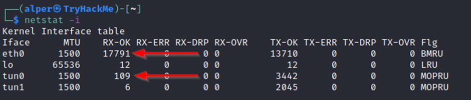 • netstat -i: Shows interface statistics. We see below that “eth0” and “tun0” are more active than “tun1”.