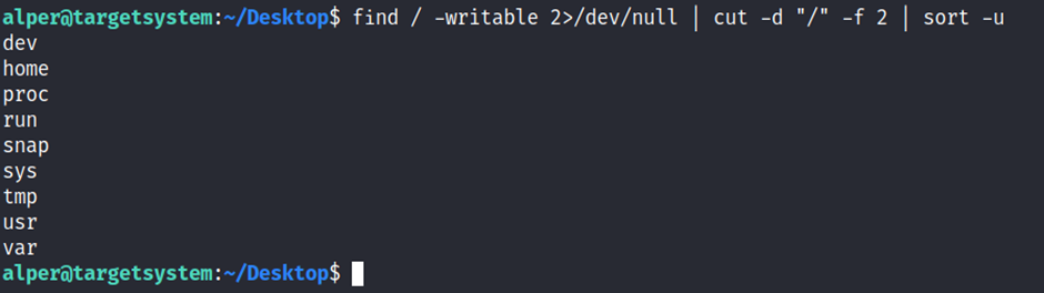 A simple search for writable folders can done using the “find / -writable 2>/dev/null” command. The output of this command can be cleaned using a simple cut and sort sequence.