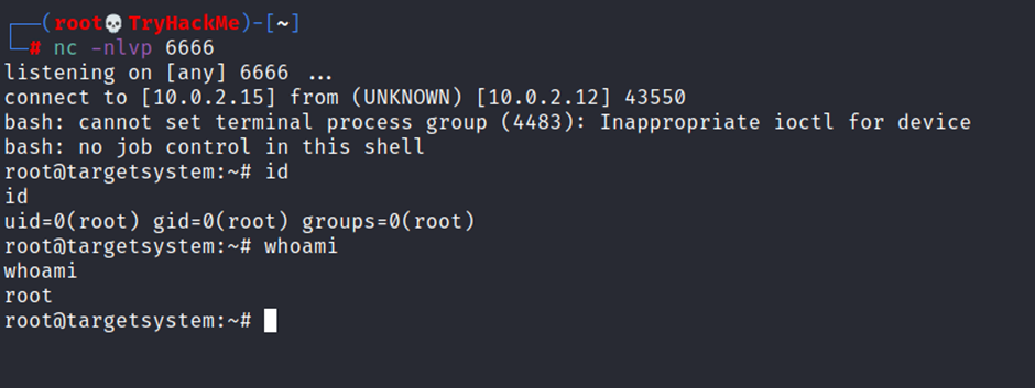 This will launch a root shell as seen below;