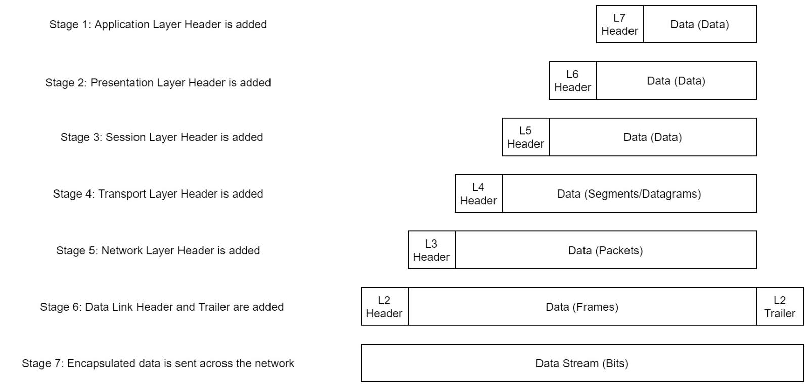 As data is passed down eacher layer of the model, more info containing details specific of the layer in question is added to the start of the transmission. Example: Header added by the network layer would be source and destination ip addresses and header added by the transport layer would included (among other things) information specific to the protocol being used. Data link adds a piece on at the end of the transmission, which is used to verify that the data has not been corrupted on transmission. Added bonus of increased security, as the data cant be intercepted and tampered with without breaking the trailer. This process is called encapsulation. The process by which data can be sent from one computer to another.