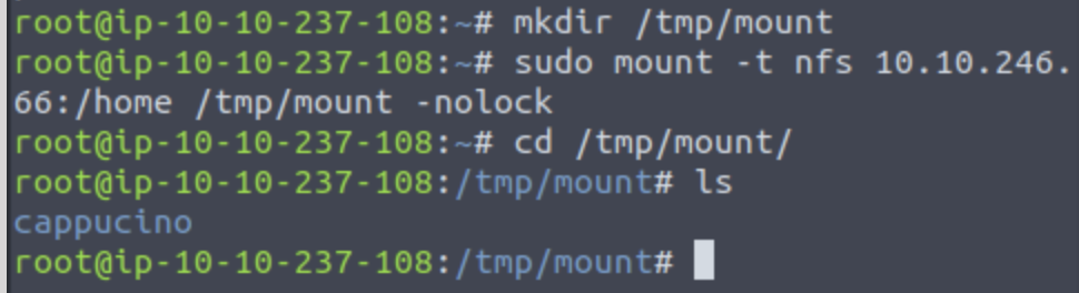 Use then the mount command we broke down earlier to mount the NFS share to your local machine. What is the name of the folder inside?