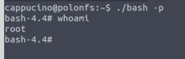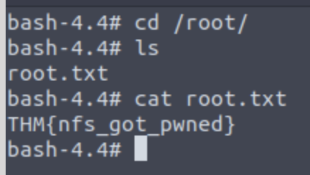 We’re able to upload files to the NFS share and control the permissions of these files. We can set permissions of whatever we upload, in this case a bash shell executable. We can then log in through SSH and execute this executable to gain a root shell!