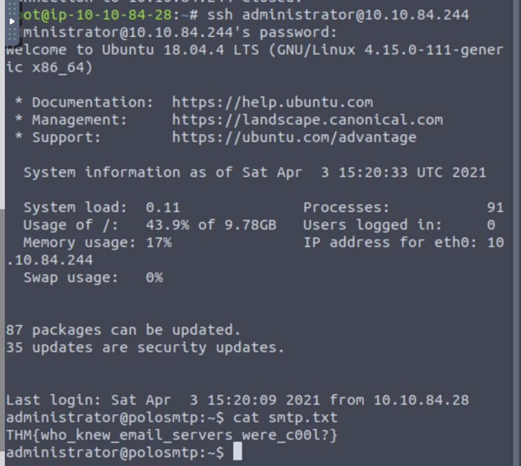 SSH into the server as the user, what is the content of smtp.txt?