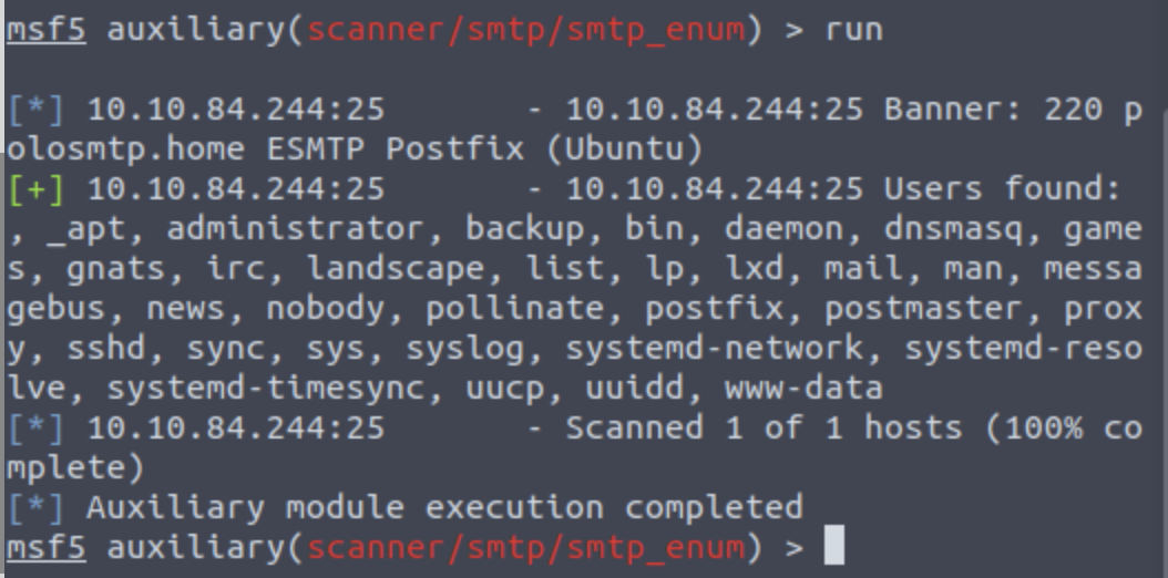We can do this manually, over a telnet connection – however Metasploit provides a handy module appropriately called “smtp_enum” that will do the legwork for us.