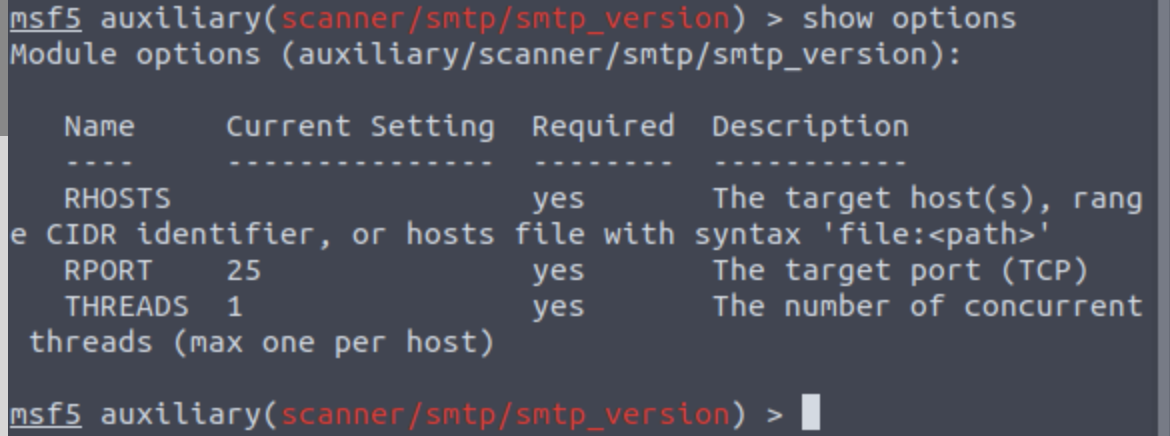Poorly configured or vulnerable mail servers can often provide initial foothold into a network, but prior to launching an attack, we want to fingerprint the server to make our targeting as precise as possible. We’re going to use the “smtp_version” module in Metasploit. It will scan a range of IP addresses and determine the verison of any mail server it encounters.
