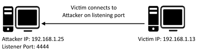 The attacking machine has a listening port, on which it receives the connection, resulting in code or command execution being achieved.