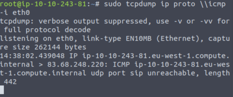 sudo tcpdump ip proto \\icmp -i eth0
