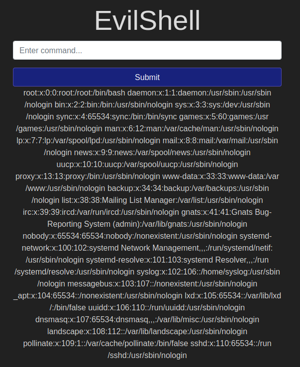 Scenario: 'EvilCrop' has started developing on a web-based shell but has accidentally left it exposed to the internet. It's nowhere near finished but contains the same command injection vulnerability as before. This time, the response from the system call can be seen on the page.