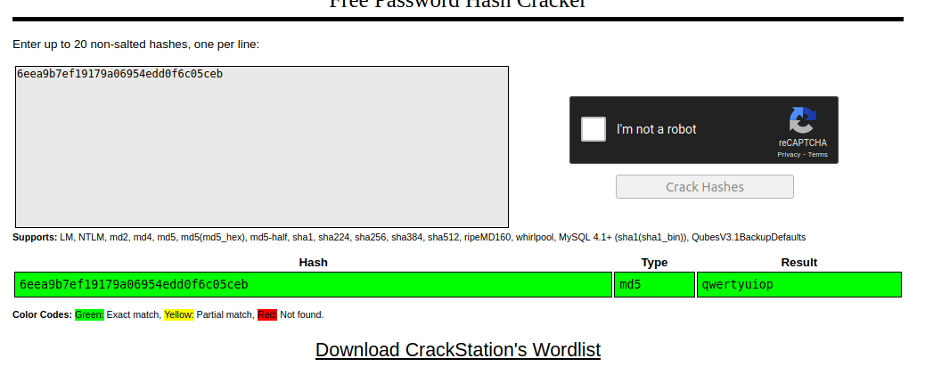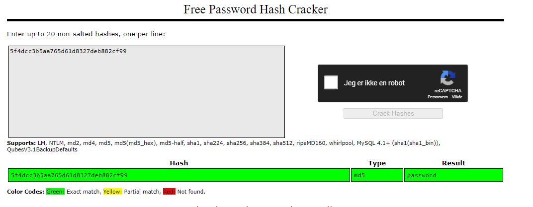 Can use various tools that comes with Kali to crack hashes. We will use Crackstation. (Se toolbox). All of the crackable password hashes used in today's challenge are weak MD5 hashes, which Crackstation should handle very nicely indeed.