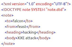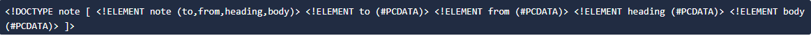 - !DOCTYPE note - Defines a root element of the document named note * !ELEMENT note - Defines that the note element must contain the elements: "to, from, heading, body" * !ELEMENT to - Defines the <to> element to be of type "#PCDATA" * !ELEMENT from - Defines the <from> element to be of type "#PCDATA" * !ELEMENT heading - Defines the <heading> element to be of type "#PCDATA"