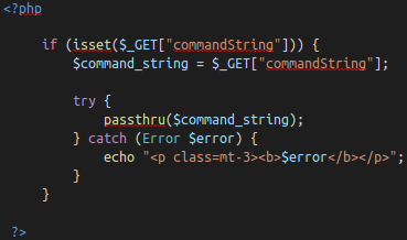 - Checking if the parameter “commandString” is set * If it is, the variable “$command_string” gets what was passed into the input field. * The program then goes into a try block to execute the function “passthru($command_string). “passthru()” executes what gets entered into the input then passes the output directly back to the browser. * If the try does not succeed, output the error page. This won't output anything because you can't output stderr but PHP doesn't let you have a try without a catch.