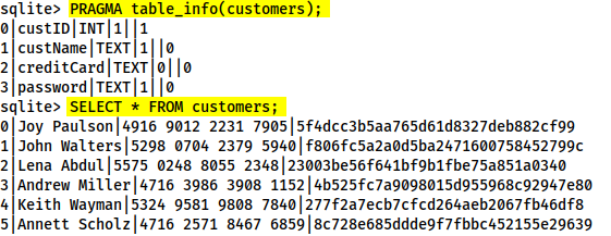 Dump all of the data from the table. “PRAGMA table_info(customers);” to see table info. Then “SELECT * FROM customers;” to dump the info from the table.