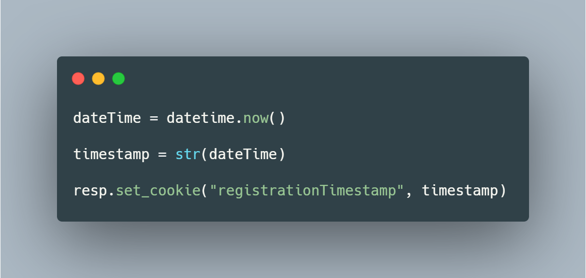 Setting cookies in Flask is trivial. The snippet above gets the current date and time, stores it within the variable “timestamp” and then stores the data and time in a cookie named “registrationTimestamp”. What it looks like in the browser: