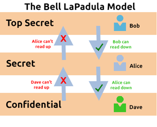 This model applies the rule to objects (data) and subjects (users) that can be summarised as "no write up, no read down". This rule means that subjects can create or write content to objects at or below their level but can only read the contents of objects above the subject's level.