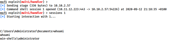 • Since the multi/handler was backgrounded, we need to use session 1 to foreground it again. If any other session is running, type sessions to see all active sessions, then use sessions <number> to select the appropriate session to foreground.