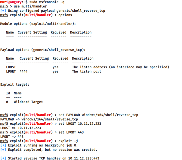 If choosing to listen on any port below 1024, you will have to use sudo when starting your listener. Good idea to use well-know port numbers as this is more likely to get past outbound firewall rules on the target.