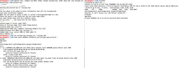 The commands sets up a OPENSSL listener using our generated certificate. verify=0 tells the connection to not bother trying to validate that our certificate has been properly signed by a recognized authority. Cert must be used on whichever device is listening.