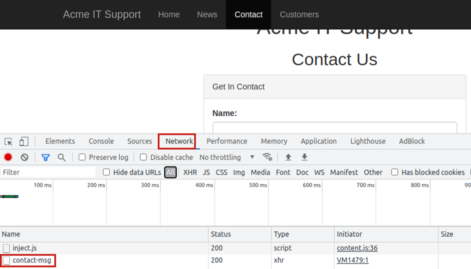 With the network tab open, try filling in the contact form and pressing the Send Message button. You'll notice an event in the network tab, and this is the form being submitted in the background using a method called AJAX. AJAX is a method for sending and receiving network data in a web application background without interfering by changing the current web page.